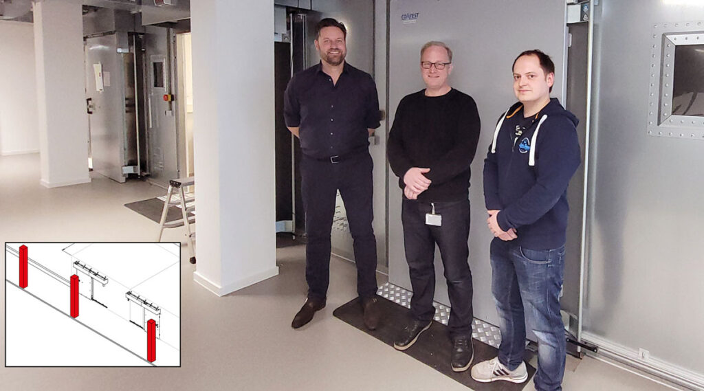 Is it possible to build nine RF-shielded test rooms over three floors in a building full of columns? Read how our designer, Britt Lise Links, made a Tetris-like solution for our client, Volkswagen Infotainment GmbH. “There are many challenges in this project. First, I had to fit six new shield rooms on the second floor of this building, keeping doors away from the many columns and enough space to move between the different rooms. For this project, all test rooms must be wheelchair accessible, so the standard 50mm door threshold is not an option. Each shield room must have a window to keep a visual connection with the inside. These RF-shielded windows are covered with a thin maze of copper to maintain the Faraday cage, so visibility is reasonable.”