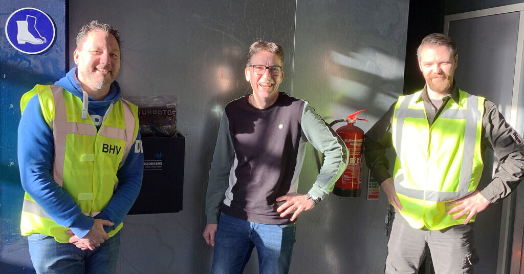 This is our Production Manager, André Oostdam, in the middle of the photo with our company security team members Ron Ligtvoet and Sebastiaan Koopmans. That morning, they had a shocking experience when one of their colleagues passed out. But thanks to the skills of the BHV team (BedrijfsHulpVerlening – company emergency response measures), an ambulance was on site in no time.