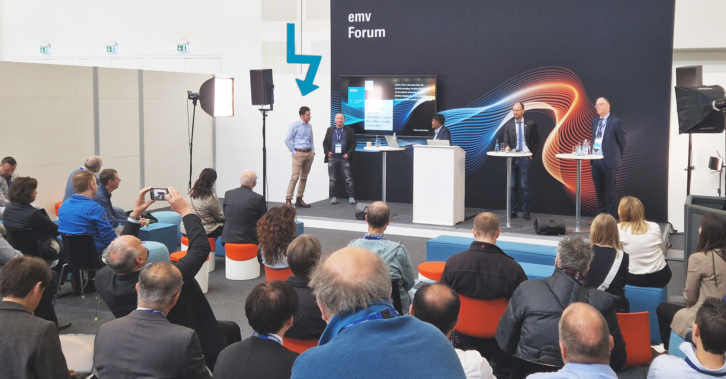 Our expert in reverberation testing, Dimitrios Barakos, was invited to discuss the future of reverb chambers. He is the one in the photo with the arrow. In the panel, you can see Martin Aidam (Daimler Benz, Germany), Vignesh Rajamani (Rohde & Schwarz), Mathias Magdowski (Otto von Guericke University, Magdeburg, Germany), and Frank Leferink (Thales / Universiteit Twente, Netherlands).