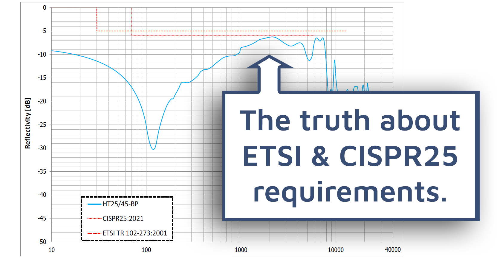 “Any test house in the world must always be compliant to the letter, which means for ETSI and CISPR25 respecting the reflectivity limit lines of this graph,” says Uliana Trucchi, one of our technical consultants with over thirty years of experience in the business.